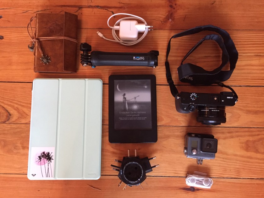 Die technische Ausrüstung hat mir den Einstieg leicht gemacht, da ich mir bei diesem Thema relativ früh im Klaren war, was ich alles mitnehmen möchte. Mit meinen Kameras, iPad, iPhone (nicht im Bild), eBook Reader und dem wichtigen Steckdosenadapter fühle ich mich gut ausgerüstet.
