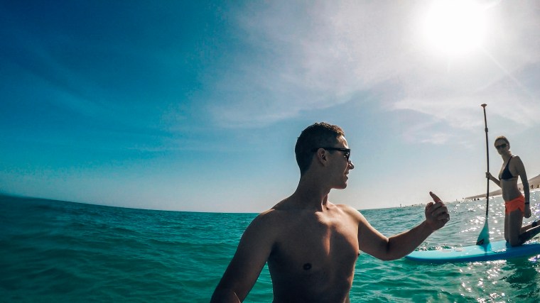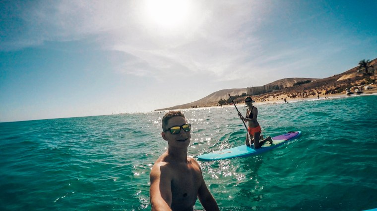 Nach unserer Rückkehr im Hotel wehte immer noch kein Lüftchen. Also haben wir uns 2 SUPs ausgeliehen und auf diesen etwas im Wasser gespielt, versucht ein paar Wellen zu reiten. Der Blick vom Wasser auf die Insel, wieder einmal traumhaft.